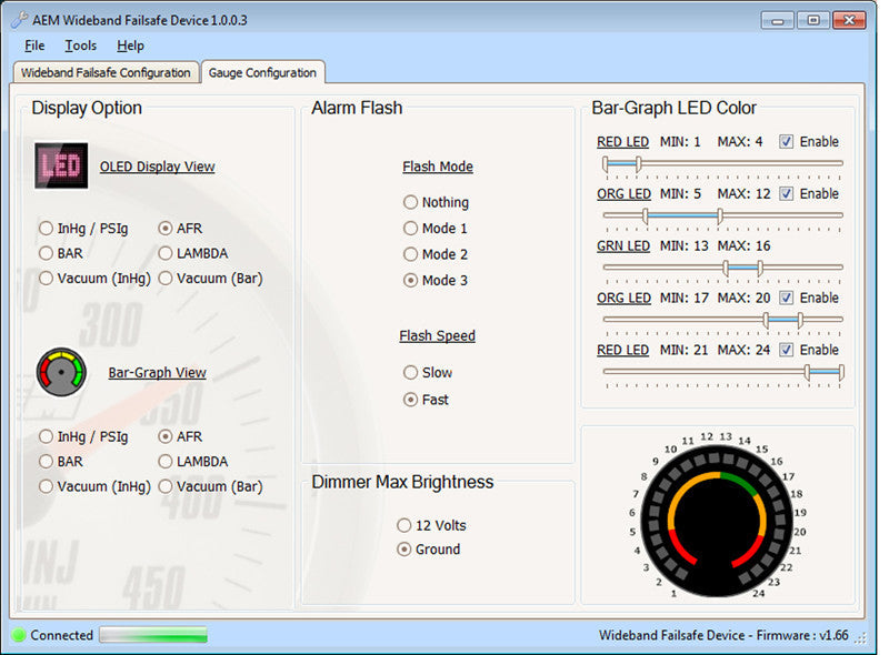 \nThe Wideband Failsafe Gauge is a Universal Exhaust Gas Oxygen (UEGO—“you-way-go”) controller with an internal boost sensor, an internal data logger and a full color Organic Light Emitting Diode (OLED) display. It includes technology to activate a failsafe strategy in the event AFR falls outside of a user-defined operating window. If the AFR falls outside of the set operating window, the Wideband FAILSAFE Gauge triggers a user defined output function that can save an engine from catastrophic damage.
