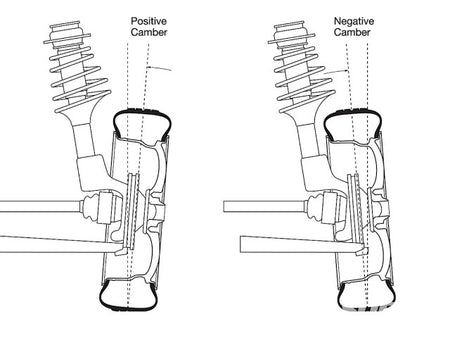 Camber is the angle at which the wheel and tire are positioned in comparison to the road assuming the road flat. While one might believe that the wheel is perfectly perpendicular to the road, it is often intentionally tilted to counteract the forces put on it by cornering. Negative camber is generally desired in track cars. Negative camber helps counteract the tendency of the tire to roll on its outer edge during cornering. In turn, this keeps as much tire on the road as possible while cornering and allowing for more grip and higher cornering speeds.